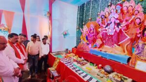 पंडाल में विराजमान मां दुर्गा के दरबार में उन्होंने मंत्रोच्चार के साथ आराधना की और जिलेवासियों के सुख-शांति एवं समृद्धि की कामना की। माता रानी की भव्य आरती में उपस्थित श्रद्धालु भी शामिल हुए और पूरा माहौल भक्तिमय हो उठा।