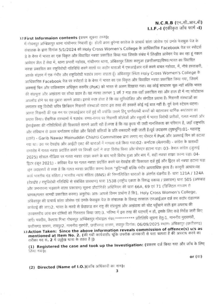 अम्बिकापुर।होली क्रॉस विमेन्स कॉलेज, अम्बिकापुर में भारत के विकृत नक्शे के प्रदर्शन के मामले में आखिरकार पुलिस ने कार्रवाई की है। कॉलेज की प्राचार्या शांता जोसफ एवं कॉलेज के फेसबुक पेज संचालक के विरुद्ध भारतीय दंड संहिता की धारा 505(1)(B) के तहत आपराधिक प्रकरण दर्ज किया गया है। वहीं, इस मामले में पुलिस की कार्यप्रणाली पर सवाल उठने लगे हैं और भाजपा नेताओं ने निष्पक्ष जांच को लेकर गंभीर आपत्तियाँ दर्ज कराई हैं।