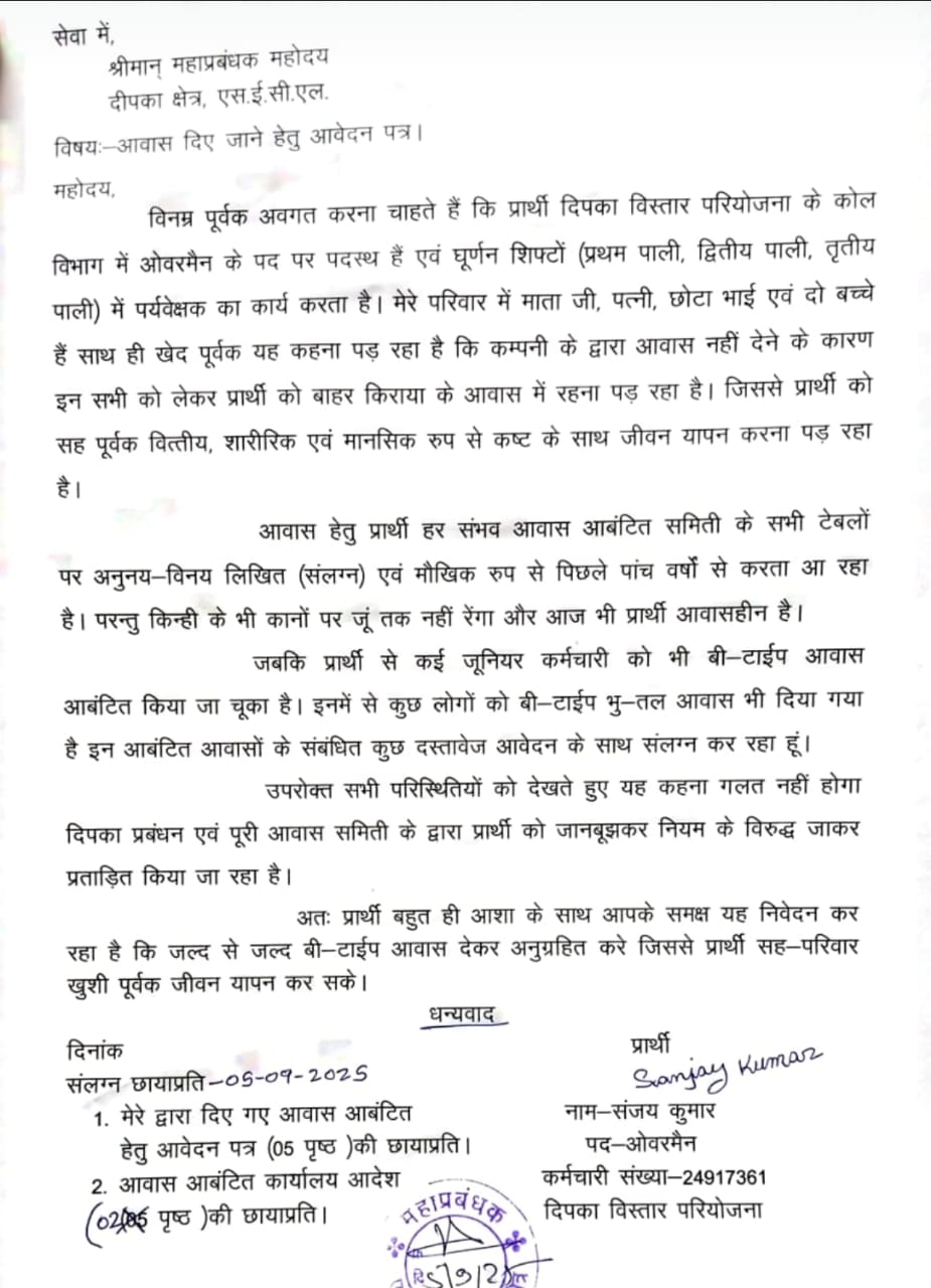 कोल विभाग के एक कर्मचारी ने महाप्रबंधक को आवेदन देते हुए कहा — “पांच साल से दर-दर की ठोकर खा रहा हूं, लेकिन आज तक आवास नहीं मिला। मुझसे जूनियर कर्मचारियों को बी-टाइप क्वार्टर तक दे दिए गए, जबकि मैं परिवार सहित किराए के मकान में रहने को मजबूर हूं। आर्थिक दबाव और मानसिक तनाव के कारण त्यौहार भी बेरंग गुजर रहे हैं।”