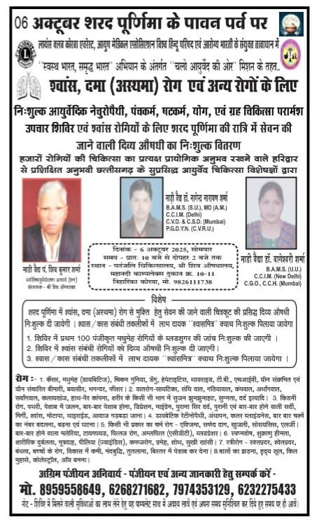 त्रिनेत्र टाइम्स कोरबा। ***। कोरबा। शरद पूर्णिमा के पावन अवसर पर स्वस्थ भारत–समृद्ध भारत अभियान एवं चलो आयुर्वेद की ओर मिशन के तहत श्वास दमा (कफज) रोगियों के लिए विशेष आयुर्वेदिक परामर्श एवं उपचार शिविर का आयोजन किया जा रहा है। यह शिविर दिनांक 06 अक्टूबर 2025, सोमवार को प्रातः 10 बजे से पतंजलि चिकित्सालय, श्री शिव औषधालय, महानदी कॉम्प्लेक्स, निहारिका रोड, कोरबा (छत्तीसगढ़) में आयोजित होगा।