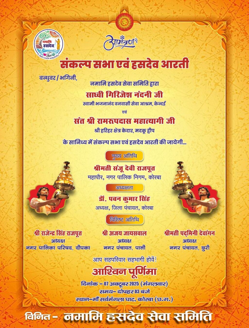 (कोरबा) — कोरबा अंचल की जीवनरेखा मानी जाने वाली हसदेव नदी के संरक्षण, स्वच्छता और तट सौंदर्यीकरण को जनआंदोलन का स्वरूप देने हेतु नमामि हसदेव सेवा समिति द्वारा आश्विन पूर्णिमा के पावन अवसर पर 7 अक्टूबर, मंगलवार को माँ सर्वमंगला घाट (कोरबा) में दोपहर 3 बजे से संकल्प सभा एवं हसदेव आरती का भव्य आयोजन किया जा रहा है। समिति का यह आयोजन धार्मिक आस्था, पर्यावरणीय चेतना और सामाजिक भागीदारी का अनूठा संगम बनने जा रहा है।