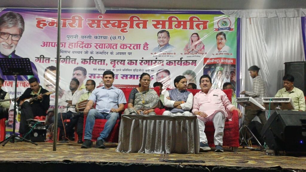 सदी के महानायक को कोरबा का सांस्कृतिक नमनअमिताभ बच्चन के जन्मदिवस पर हमारी संस्कृति समिति ने किया भव्य सम्मान समारोह — महापौर संजू देवी राजपूत सहित गणमान्य अतिथियों की उपस्थिति में गीत-संगीत से गूंजा शहर