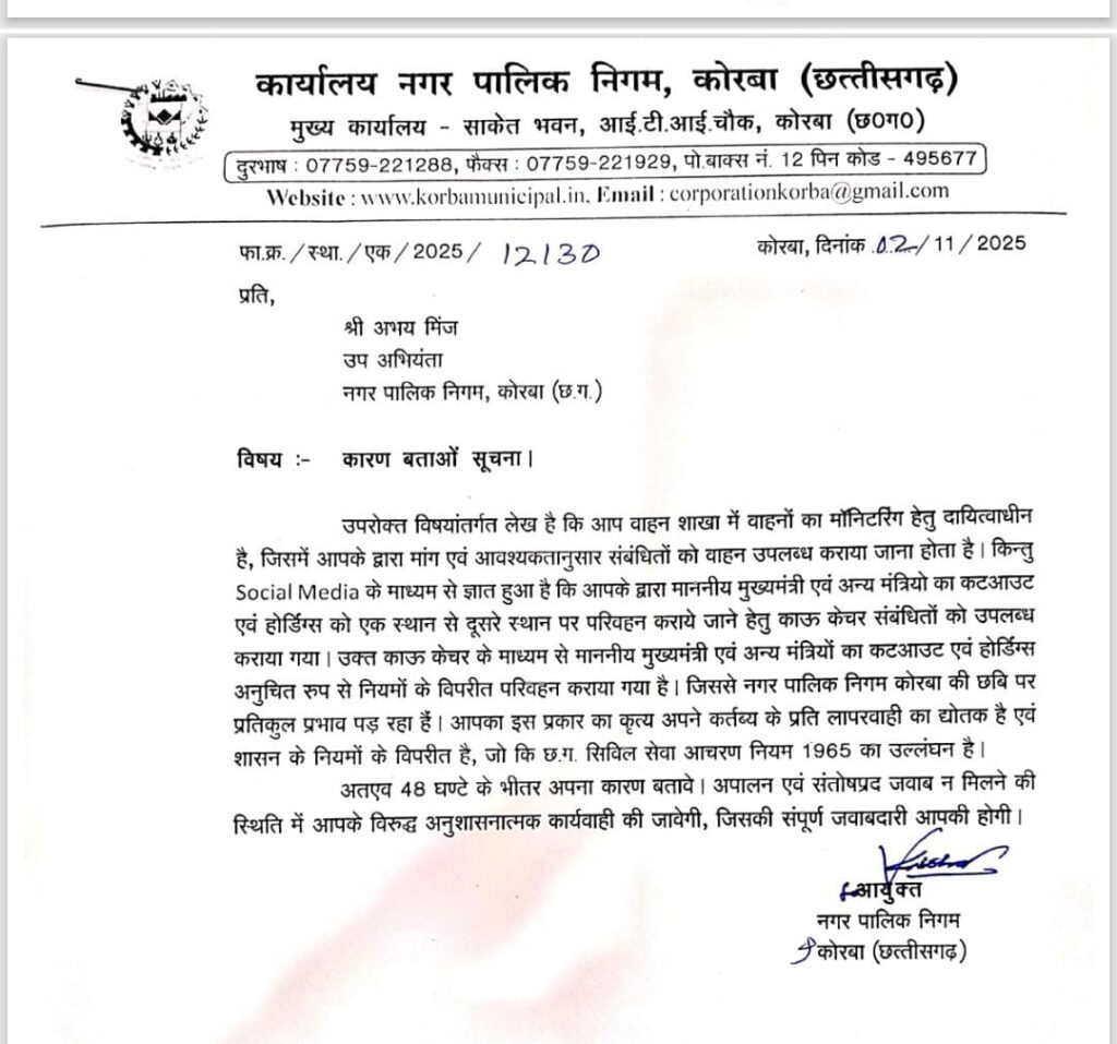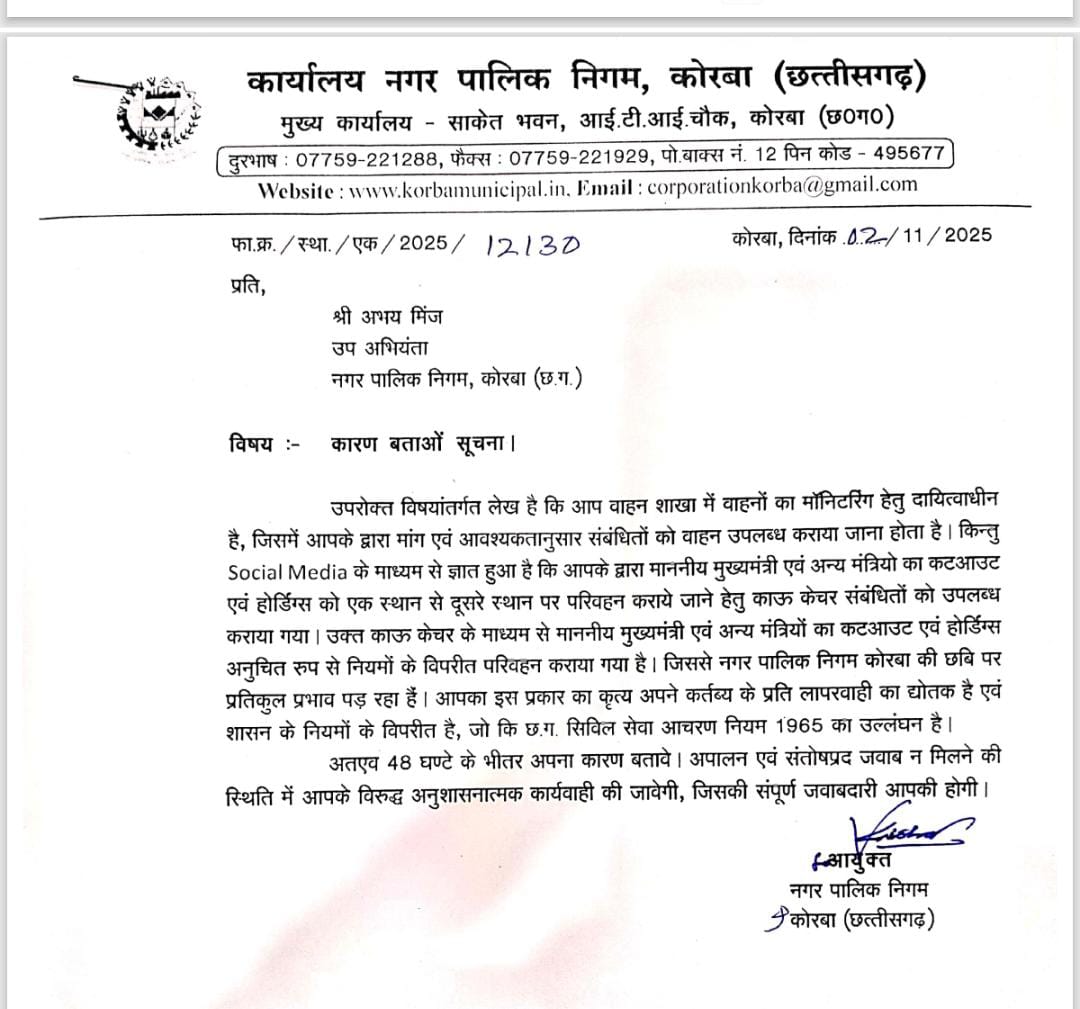 त्रिनेत्र टाइम्स कोरबा ****/कोरबा। नगर पालिक निगम कोरबा में वाहन शाखा में पदस्थ उप अभियंता अभय मिंज पर वाहन दुरुपयोग का गंभीर आरोप सामने आया है। नगर निगम प्रशासन ने इस मामले को बेहद गंभीरता से लेते हुए उप अभियंता को कारण बताओ नोटिस जारी किया है।