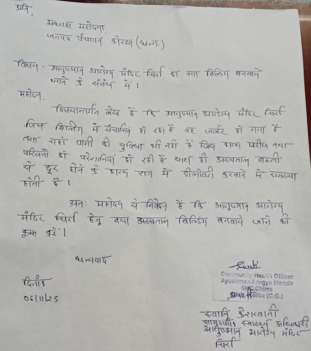 त्रिनेत्र टाइम्स कोरबा ****/ कोरबा जिले के ग्राम चिर्रा में संचालित सामुदायिक स्वास्थ्य केंद्र (आयुष्मान आरोग्य मंदिर) की स्थिति बेहद जर्जर और चिंताजनक पाई गई है। यह स्वास्थ्य केंद्र पिछले कई वर्षों से वन विभाग के पुराने भवन में संचालित हो रहा है, जो अब पूरी तरह जर्जर अवस्था में पहुँच चुका है। भवन की दीवारों और छत में दरारें आने लगी हैं, जिससे किसी भी समय जनहानि होने का भय बना रहता है।