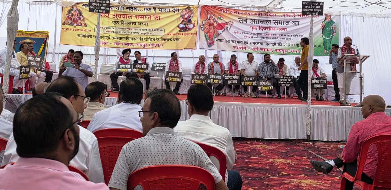 राजधानी रायपुर के अग्रसेन चौक, समता कॉलोनी में छत्तीसगढ़ प्रांतीय अग्रवाल संगठन के नेतृत्व में “सर्व अग्रवाल समाज” द्वारा किया गया शांतिपूर्ण धरना आज एक महाआंदोलन का रूप ले चुका है।