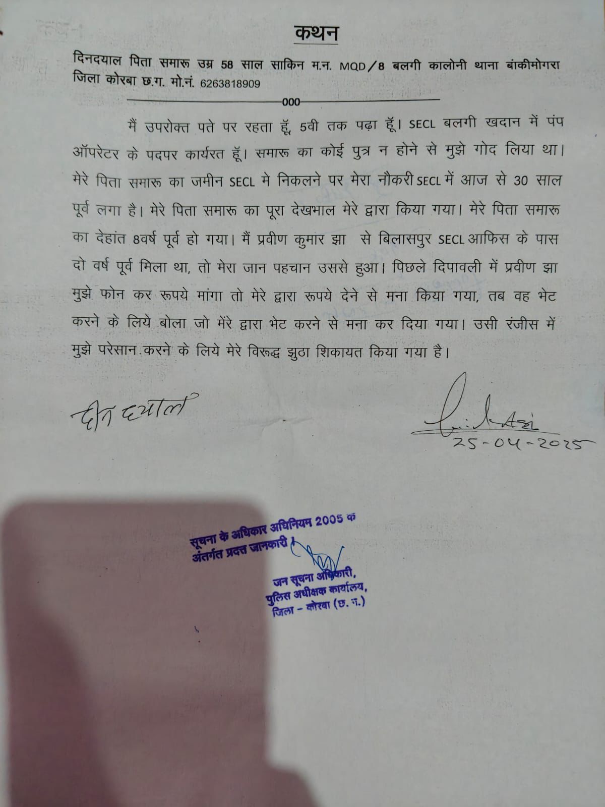 जानकारी के अनुसार, SECL की बलगी परियोजना में पंप ऑपरेटर के पद पर कार्यरत दीनदयाल गुप्ता की मुलाकात पीड़िता से 20 मार्च 2025 को हुई थी। आरोप है कि दीनदयाल ने युवती को SECL में नौकरी दिलाने का लालच देकर 5 लाख रुपये की माँग की थी।