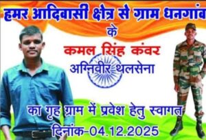 त्रिनेत्र टाइम्स कोरबा ****/ कोरबा/धनगांव। ग्राम पंचायत धनगांव के गौरव, अग्निवीर थलसेना में सेवा दे रहे कमल सिंह कंवर के प्रथम गृह आगमन पर पूरे गाँव में उत्साह और गर्व का माहौल देखने को मिला।