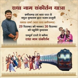 छत्तीसगढ़ एक्सप्रेस में गूंजेगा राधा नाम, रायपुर–कोरबा–रायगढ़ से वृंदावन तक भव्य संकीर्तन यात्रा, वृंदावन में होगा 151 पोथी श्रीमद्भागवत कथा महायज्ञ