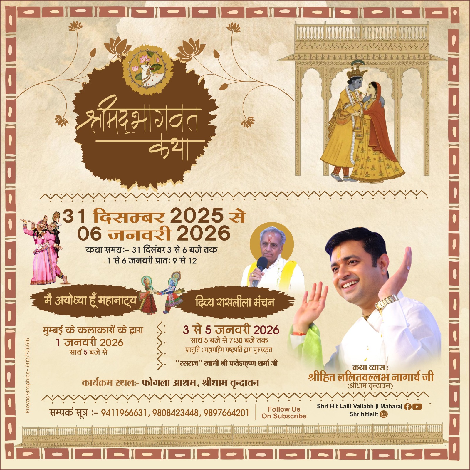 वृंदावन पहुंचने के पश्चात वहां 151 पोथी श्रीमद्भागवत कथा महायज्ञ का भव्य एवं दिव्य आयोजन किया जाएगा। यह महायज्ञ श्री हित ललित नागराज महाराज जी के पावन सान्निध्य में संपन्न होगा, जिसमें देशभर से श्रद्धालु, संत-महात्मा एवं भक्तजन बड़ी संख्या में सहभागिता करेंगे। श्रीमद्भागवत कथा के माध्यम से धर्म, भक्ति, सनातन संस्कृति एवं जीवन मूल्यों का व्यापक संदेश दिया जाएगा।