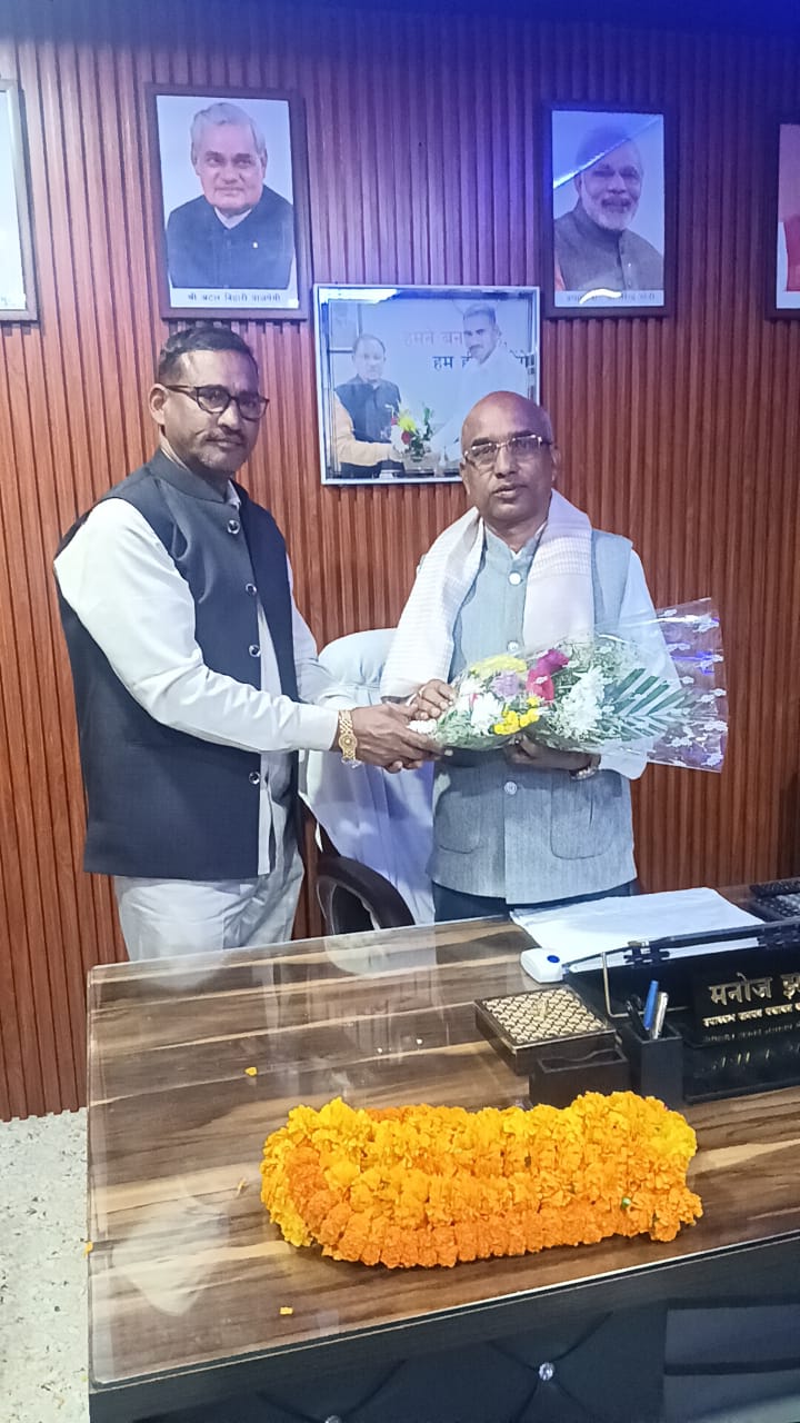 त्रिनेत्र टाइम्स कोरबा ****// करतला। छत्तीसगढ़ चर्म शिल्पकार बोर्ड के अध्यक्ष ध्रुव कुमार मिर्जा का करतला जनपद पंचायत उपाध्यक्ष मनोज झा के निवास पर आगमन हुआ। इस अवसर पर जनपद उपाध्यक्ष मनोज झा द्वारा श्रीफल, साल एवं पुष्पगुच्छ भेंट कर उनका आत्मीय एवं गरिमामय स्वागत किया गया।