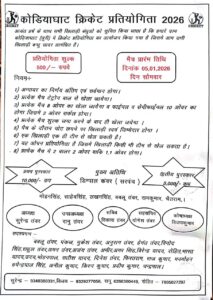 त्रिनेत्र टाइम्स कोरबा ****//*कोरबा विकासखंड अंतर्गत ग्राम कोड़ियाघाट (छुरी) में खेल प्रेमियों के लिए रोमांच से भरपूर कोड़ियाघाट क्रिकेट प्रतियोगिता 2026 का भव्य आयोजन किया जा रहा है। ग्रामीण प्रतिभाओं को मंच देने और युवाओं में खेल भावना को प्रोत्साहित करने के उद्देश्य से आयोजित यह प्रतियोगिता आगामी 05 जनवरी 2026, सोमवार से प्रारंभ होगी।