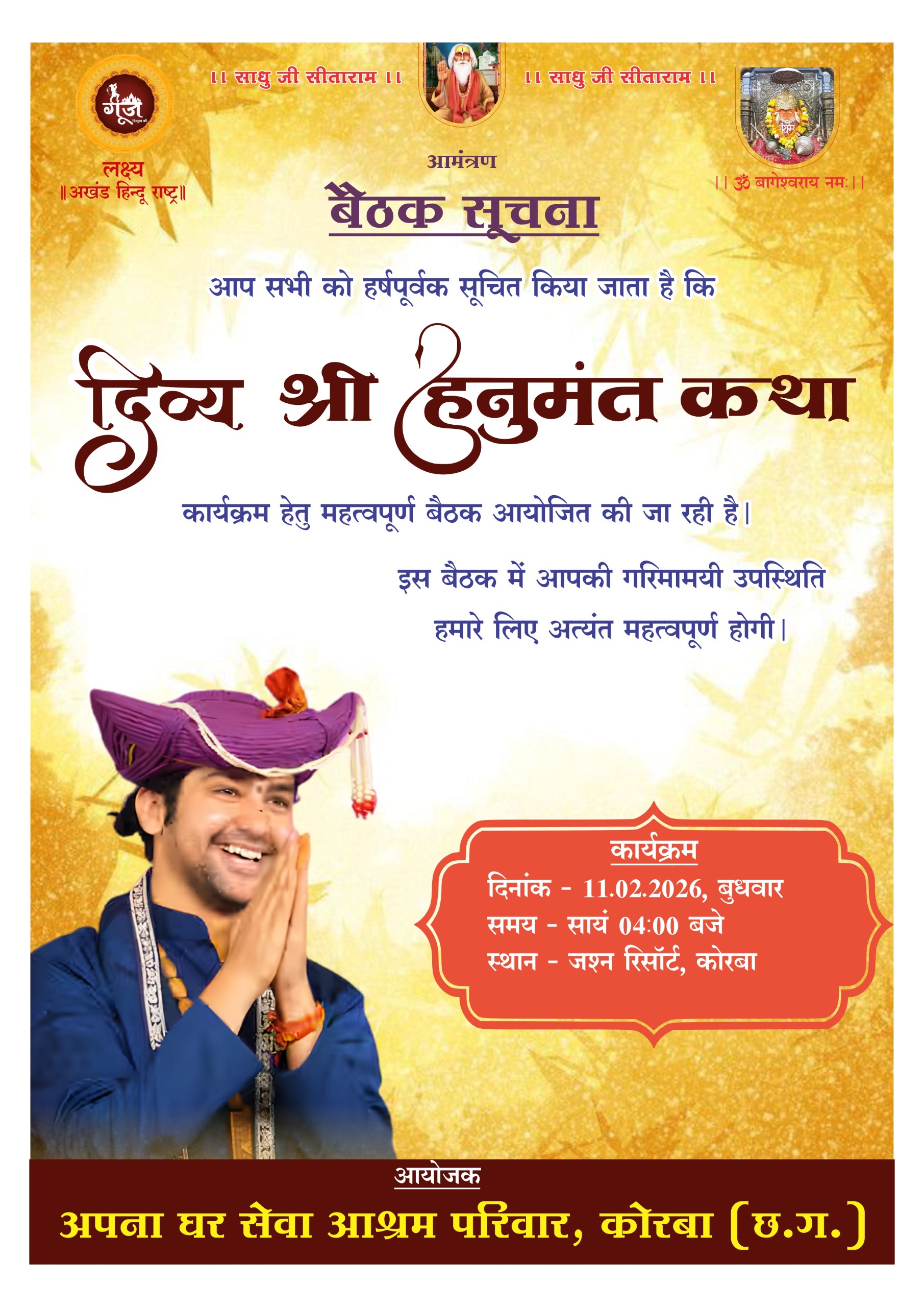 त्रिनेत्र टाइम्स कोरबा ****//** कोरबा परम पूज्य धीरेंद्र शास्त्री जी (बागेश्वर धाम) के कोरबा में प्रस्तावित कार्यक्रम को सफल और ऐतिहासिक बनाने के उद्देश्य से दिनांक 11 फरवरी (बुधवार) को जश्न रिज़ॉर्ट, कोरबा में एक महत्वपूर्ण समन्वय बैठक आयोजित की जा रही है। इस बैठक में कार्यक्रम की रूपरेखा, व्यवस्थाओं, प्रचार-प्रसार, सुरक्षा एवं श्रद्धालुओं की सुविधाओं को लेकर विस्तार से चर्चा की जाएगी।