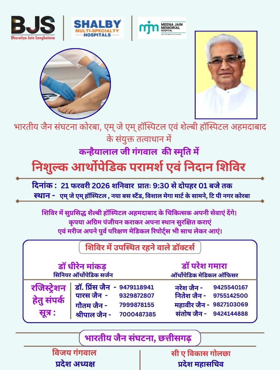 त्रिनेत्र टाइम्स कोरबा ****//** कोरबा। शहरवासियों के लिए राहत भरी खबर है। भारतीय जैन संगठन (बीजेएस) कोरबा, एम जे एम हॉस्पिटल एवं शेल्बी हॉस्पिटल अहमदाबाद के संयुक्त तत्वावधान में स्व. कन्हैयालाल जी गंगवाल की स्मृति में एक भव्य निःशुल्क आर्थोपेडिक परामर्श एवं निदान शिविर का आयोजन किया जा रहा है। यह शिविर 21 फरवरी 2026 (शनिवार) को सुबह 9:30 बजे से दोपहर 1:00 बजे तक एम जे एम हॉस्पिटल परिसर, नया बस स्टैंड, विशाल मेगा मार्ट के सामने, टीपी नगर कोरबा में आयोजित होगा।