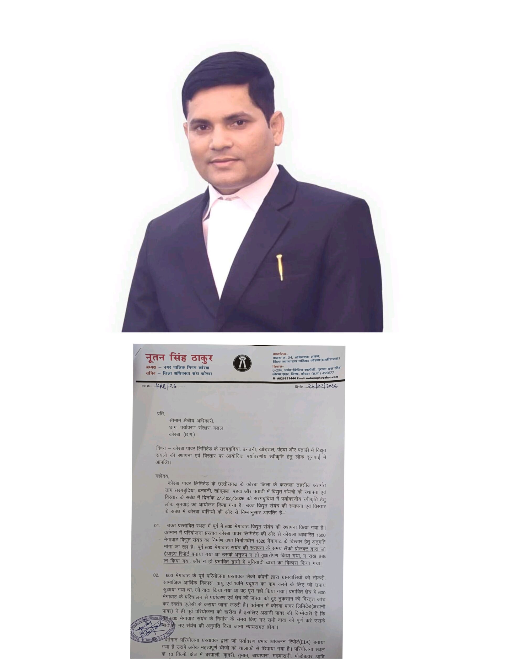 नूतन सिंह ठाकुर ने कहा कि कोरबा शहर चारों दिशाओं से कोयला आधारित पावर परियोजनाओं से घिरा हुआ है। उन्होंने दावा किया कि एनटीपीसी, सीएसईबी, बालको, स्वास्तिक और लैंको जैसे संयंत्रों के कारण शहर पहले से ही गंभीर वायु एवं ध्वनि प्रदूषण का सामना कर रहा है। लगभग 4500 मेगावाट से अधिक स्थापित क्षमता के बीच नया संयंत्र जोड़ना पर्यावरणीय संतुलन को और बिगाड़ देगा।