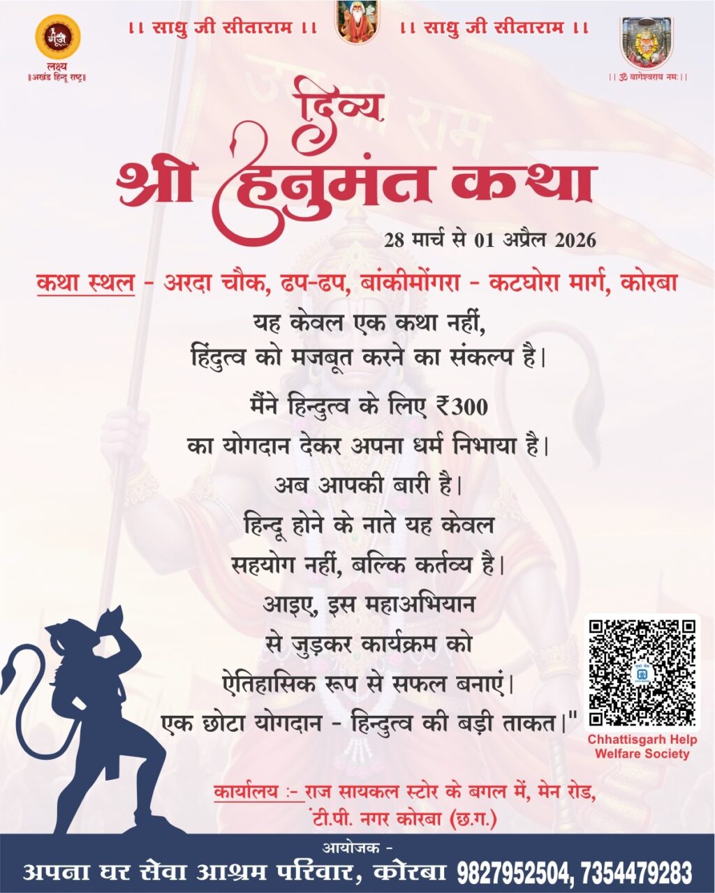 ЁЯФе рдХреЛрд░рдмрд╛ рдореЗрдВ рдЧреВрдВрдЬреЗрдЧрд╛ рдмрдЬрд░рдВрдЧ рдмрд▓реА рдХрд╛ рдЬрдпрдШреЛрд╖: 28 рдорд╛рд░реНрдЪ рд╕реЗ 1 рдЕрдкреНрд░реИрд▓ рддрдХ тАШрджрд┐рд╡реНрдп рд╢реНрд░реА рд╣рдиреБрдордВрдд рдХрдерд╛тАЩ рдХрд╛ рднрд╡реНрдп рдЖрдпреЛрдЬрди ЁЯФе