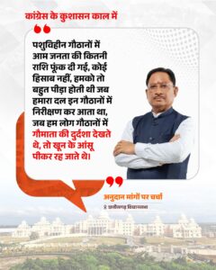 मुख्यमंत्री ने कहा कि कांग्रेस सरकार की योजनाएं कागजों तक सीमित रहीं। उन्होंने नरवा, गरुवा, घुरुवा, बारी योजना का जिक्र करते हुए कहा कि इनका वास्तविक हाल प्रदेश की जनता भलीभांति जानती है। गौठानों की स्थिति पर उन्होंने कहा कि पशुविहीन गौठानों में जनता की भारी राशि खर्च की गई, लेकिन वहां गौमाता की दुर्दशा देखकर