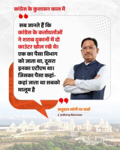 मुख्यमंत्री ने आबकारी व्यवस्था को लेकर कांग्रेस पर गंभीर आरोप लगाते हुए कहा कि शराब दुकानों में दो काउंटर चलाए जाते थे—एक का पैसा विभाग को जाता था और दूसरा कांग्रेस का “एटीएम” था। उन्होंने कहा कि यह पैसा कहां-कहां जाता था, यह सबको मालूम है।
