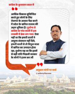 मुख्यमंत्री ने कहा कि प्रदेश के आर्थिक विकास और रोजगार सृजन में खनिज राजस्व की अहम भूमिका है, लेकिन कांग्रेस के पांच वर्षों में इस क्षेत्र की तरक्की पर ब्रेक लग गया। उन्होंने आरोप लगाया कि ट्रांजिट पास को ऑनलाइन के बजाय मैनुअल कर करोड़ों रुपये का भ्रष्टाचार किया गया और जनता के हिस्से का पैसा निजी लाभ में चला गया।