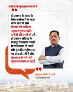 डीएमएफ को लेकर मुख्यमंत्री ने कहा कि कांग्रेस शासनकाल में नियमों की अनदेखी कर गैरजरूरी और गुणवत्ताहीन कार्यों में राशि खर्च की गई। उन्होंने कहा कि कलेक्टरों को फोन कर दबाव बनाया जाता था और डीएमएफ संहिता के विरुद्ध खर्च किए जाते थे, जिसकी जांच अब राष्ट्रीय स्तर पर हो रही है।