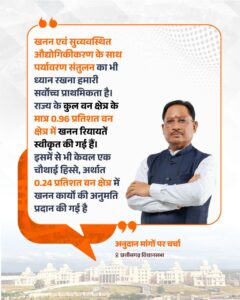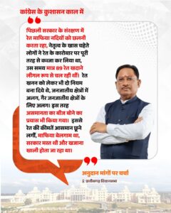 रेत खनन को लेकर मुख्यमंत्री ने कहा कि पिछली सरकार के संरक्षण में रेत माफिया सक्रिय रहा और नदियों का अंधाधुंध दोहन किया गया। उन्होंने कहा कि उस समय मात्र 89 रेत खदानें वैध थीं, जबकि बाकी कारोबार माफिया के नियंत्रण में था। उन्होंने यह भी आरोप लगाया कि जनजातीय और गैर-जनजातीय क्षेत्रों के लिए अलग-अलग नियम बनाकर असमानता को बढ़ावा दिया गया, जिससे रेत की कीमतें आसमान छूने लगीं।