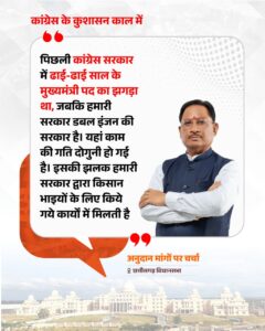 युवाओं के संदर्भ में मुख्यमंत्री ने कहा कि कांग्रेस के पांच साल युवाओं के लिए “बुरे सपने” की तरह थे, जहां स्टार्टअप के अवसरों के बजाय प्रतियोगी परीक्षाओं में भी भ्रष्टाचार हुआ।