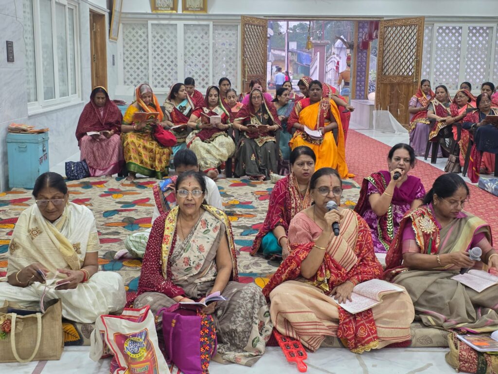 рд╕рд╛рдпрдВ 4 рдмрдЬреЗ рд╕реЗ 7 рдмрдЬреЗ рддрдХ рдЖрдпреЛрдЬрд┐рдд рд╕рдВрдЧреАрддрдордп рдордВрдЧрд▓рдкрд╛рда рдореЗрдВ рд╢реНрд░реАрдорддреА рд▓реАрдирд╛ рдЕрдЧреНрд░рд╡рд╛рд▓ рдПрд╡рдВ рдЙрдирдХреА рднрдЬрди рдордВрдбрд▓реА рдиреЗ рдордзреБрд░ рднрдЬрдиреЛрдВ рдФрд░ рдордВрдЧрд▓рдЧреАрддреЛрдВ рдХреЗ рдорд╛рдзреНрдпрдо рд╕реЗ рдРрд╕рд╛ рд╡рд╛рддрд╛рд╡рд░рдг рдирд┐рд░реНрдорд┐рдд рдХрд┐рдпрд╛ рдХрд┐ рдкреВрд░рд╛ рдордВрджрд┐рд░ рдкрд░рд┐рд╕рд░ рднрдХреНрддрд┐ рдореЗрдВ рдЭреВрдо рдЙрдард╛ред рдЗрд╕ рджреМрд░рд╛рди рдЙрдкрд╕реНрдерд┐рдд рдордВрдЧрд▓рдкрд╛рдареА рдмрд╣рдиреЛрдВ рдиреЗ рдкрд╛рд░рдВрдкрд░рд┐рдХ рд╡реЗрд╢рднреВрд╖рд╛тАФрдирде, рдЪреВрдбрд╝рд╛ рдФрд░ рдЪреБрдирдбрд╝реА рдзрд╛рд░рдг рдХрд░ рдПрдХ рд╕реНрд╡рд░, рдПрдХ рд▓рдп рдФрд░ рдПрдХ рд░рд╛рдЧ рдореЗрдВ рдордВрдЧрд▓рдкрд╛рда рдкреНрд░рд╕реНрддреБрдд рдХрд┐рдпрд╛, рдЬрд┐рд╕рдиреЗ рд╢реНрд░рджреНрдзрд╛рд▓реБрдУрдВ рдХреЛ рднрд╛рд╡рд╡рд┐рднреЛрд░ рдХрд░ рджрд┐рдпрд╛ред