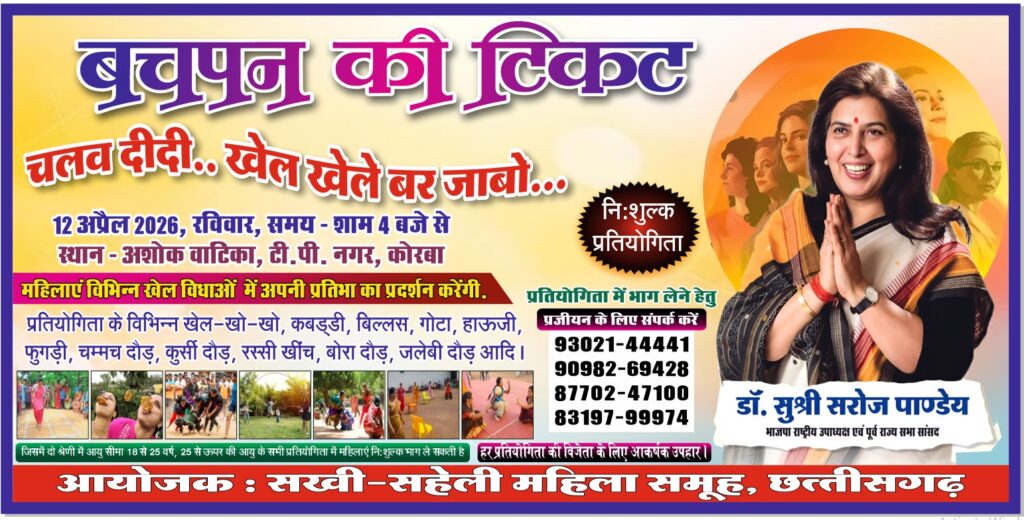 12 अप्रैल 2026, रविवार को अशोक वाटिका, टी.पी. नगर, कोरबा में महिलाओं के लिए एक विशाल निःशुल्क खेल प्रतियोगिता का आयोजन किया जा रहा है, जिसमें शहर और आसपास की महिलाएं अपने बचपन के खेल, उत्साह और प्रतिभा का प्रदर्शन करेंगी।