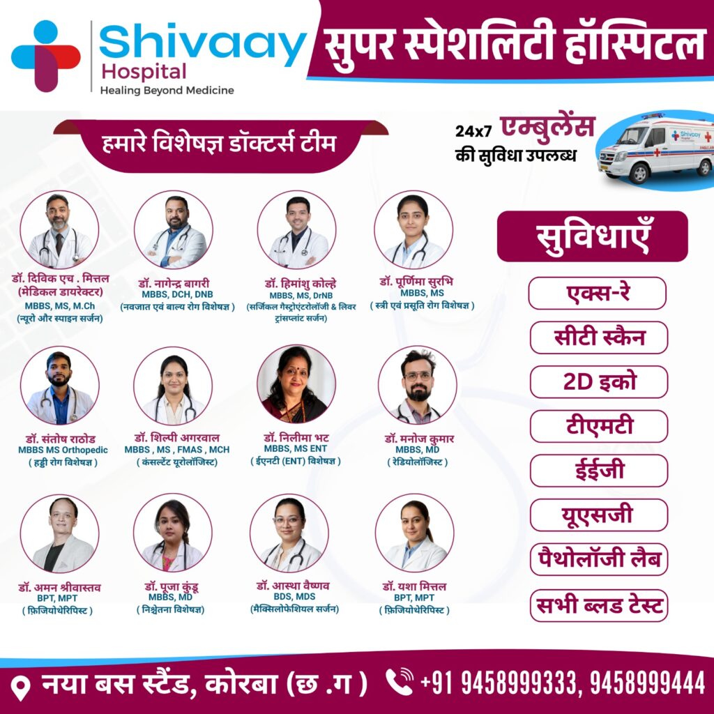 рдХреЛрд░рдмрд╛ рдЬрд┐рд▓реЗ рдореЗрдВ рд╕реНрд╡рд╛рд╕реНрдереНрдп рд╕реЗрд╡рд╛рдУрдВ рдХреЗ рдХреНрд╖реЗрддреНрд░ рдореЗрдВ рдПрдХ рдРрддрд┐рд╣рд╛рд╕рд┐рдХ рдмрджрд▓рд╛рд╡ рджреЗрдЦрдиреЗ рдХреЛ рдорд┐рд▓ рд░рд╣рд╛ рд╣реИред Shivaay Hospital рдиреЗ рд╡рд╣ рдореБрдХрд╛рдо рд╣рд╛рд╕рд┐рд▓ рдХрд░ рд▓рд┐рдпрд╛ рд╣реИ, рдЬрд┐рд╕рдХреА рдХрд▓реНрдкрдирд╛ рдЕрдм рддрдХ рдХреЗрд╡рд▓ рдмрдбрд╝реЗ рдорд╣рд╛рдирдЧрд░реЛрдВ рддрдХ рд╕реАрдорд┐рдд рдорд╛рдиреА рдЬрд╛рддреА рдереАред рдПрдХ рд╣реА рдЫрдд рдХреЗ рдиреАрдЪреЗ рдЗрддрдиреА рд╡рд┐рд╢рд╛рд▓, рдЕрдиреБрднрд╡реА рдФрд░ рд╕реБрдкрд░ рд╕реНрдкреЗрд╢рд▓рд┐рд╕реНрдЯ рдбреЙрдХреНрдЯрд░реЛрдВ рдХреА рдЯреАрдо рдХрд╛ рдЙрдкрд▓рдмреНрдз рд╣реЛрдирд╛ рди рдХреЗрд╡рд▓ рдХреЛрд░рдмрд╛, рдмрд▓реНрдХрд┐ рдкреВрд░реЗ рдЕрдВрдЪрд▓ рдХреЗ рд▓рд┐рдП рдХрд┐рд╕реА рдмрдбрд╝реА рдЙрдкрд▓рдмреНрдзрд┐ рд╕реЗ рдХрдо рдирд╣реАрдВ рд╣реИред
