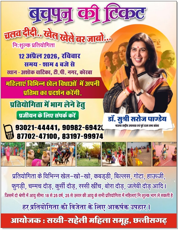 рддреНрд░рд┐рдиреЗрддреНрд░ рдЯрд╛рдЗрдореНрд╕ рдХреЛрд░рдмрд╛ ****//** рдХреЛрд░рдмрд╛ред рдорд╣рд┐рд▓рд╛рдУрдВ рдХреА рдкреНрд░рддрд┐рднрд╛, рдКрд░реНрдЬрд╛ рдФрд░ рдЖрддреНрдорд╡рд┐рд╢реНрд╡рд╛рд╕ рдХреЛ рдордВрдЪ рджреЗрдиреЗ рдХреЗ рдЙрджреНрджреЗрд╢реНрдп рд╕реЗ рд╕рдЦреА-рд╕рд╣реЗрд▓реА рдорд╣рд┐рд▓рд╛ рд╕рдореВрд╣, рдЫрддреНрддреАрд╕рдЧрдврд╝ рджреНрд╡рд╛рд░рд╛ рдПрдХ рдЕрдиреЛрдЦрд╛ рдФрд░ рдЖрдХрд░реНрд╖рдХ рдЖрдпреЛрдЬрди тАЬрдмрдЪрдкрди рдХреА рдЯрд┐рдХрдЯтАЭ рдХрд╛ рдЖрдпреЛрдЬрди рдХрд┐рдпрд╛ рдЬрд╛ рд░рд╣рд╛ рд╣реИред рдпрд╣ рднрд╡реНрдп рдПрд╡рдВ рд░рдВрдЧрд╛рд░рдВрдЧ рдкреНрд░рддрд┐рдпреЛрдЧрд┐рддрд╛ 12 рдЕрдкреНрд░реИрд▓ 2026, рд░рд╡рд┐рд╡рд╛рд░ рдХреЛ рд╢рд╛рдо 4 рдмрдЬреЗ рд╕реЗ рдЕрд╢реЛрдХ рд╡рд╛рдЯрд┐рдХрд╛, рдЯреА.рдкреА. рдирдЧрд░, рдХреЛрд░рдмрд╛ рдореЗрдВ рдЖрдпреЛрдЬрд┐рдд рд╣реЛрдЧреА, рдЬрд┐рд╕рдореЗрдВ рдорд╣рд┐рд▓рд╛рдУрдВ рдХреЗ рд▓рд┐рдП рдкреВрд░реА рддрд░рд╣ рдирд┐рдГрд╢реБрд▓реНрдХ рднрд╛рдЧреАрджрд╛рд░реА рд░рдЦреА рдЧрдИ рд╣реИред