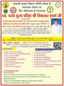 рдХреЛрд░рдмрд╛ред рдорд╛рд░рд╡рд╛рдбрд╝реА рдмреНрд░рд╛рд╣реНрдордг рд╡рд┐рдХрд╛рд╕ рд╕рдорд┐рддрд┐ рдХреЗ рд╕рдВрд╕реНрдерд╛рдкрдХ рд╕рджрд╕реНрдп рдПрд╡рдВ рд╢рд┐рд╡ рдФрд╖рдзрд╛рд▓рдп рдХреЗ рд╕рдВрд╕реНрдерд╛рдкрдХ рд╕реНрд╡рд░реНрдЧреАрдп рдкрд░рдо рдкреВрдЬреНрдп рдкрдВрдбрд┐рдд рд╡рд┐рджреНрдпрд╛рдзрд░ рд╢рд░реНрдорд╛ рдЬреА рдХреА рдкреБрдгреНрдпрддрд┐рдерд┐ рдХреЗ рдЕрд╡рд╕рд░ рдкрд░ 19 рдЕрдкреНрд░реИрд▓ 2026, рд░рд╡рд┐рд╡рд╛рд░ рдХреЛ рдПрдХ рднрд╡реНрдп рдПрд╡рдВ рд╡реГрд╣рджреН рдирд┐рдГрд╢реБрд▓реНрдХ рд╕реНрд╡рд╛рд╕реНрдереНрдп рд╢рд┐рд╡рд┐рд░ рдХрд╛ рдЖрдпреЛрдЬрди рдХрд┐рдпрд╛ рдЬрд╛ рд░рд╣рд╛ рд╣реИред рдпрд╣ рд╢рд┐рд╡рд┐рд░ рдорд╛рд░рд╡рд╛рдбрд╝реА рдмреНрд░рд╛рд╣реНрдордг рд╡рд┐рдХрд╛рд╕ рд╕рдорд┐рддрд┐, рд╢рд┐рд╡ рдФрд╖рдзрд╛рд▓рдп, рд▓рд╛рдпрдВрд╕ рдХреНрд▓рдм рдХреЛрд░рдмрд╛ рдПрд╡рд░реЗрд╕реНрдЯ, рдиреАрдорд╛ рдПрд╡рдВ рдЖрдпреБрд╖ рдореЗрдбрд┐рдХрд▓ рдПрд╕реЛрд╕рд┐рдПрд╢рди рдХреЗ рд╕рдВрдпреБрдХреНрдд рддрддреНрд╡рд╛рд╡рдзрд╛рди рдореЗрдВ рдкрддрдВрдЬрд▓рд┐ рдЪрд┐рдХрд┐рддреНрд╕рд╛рд▓рдп, рд╢реНрд░реА рд╢рд┐рд╡ рдФрд╖рдзрд╛рд▓рдп (рджреБрдХрд╛рди рдХреНрд░рдорд╛рдВрдХ 10-11, рдорд╣рд╛рдирджреА рдХреЙрдореНрдкреНрд▓реЗрдХреНрд╕, рдирд┐рд╣рд╛рд░рд┐рдХрд╛ рд░реЛрдб) рдореЗрдВ рдкреНрд░рд╛рддрдГ 10 рдмрдЬреЗ рд╕реЗ рджреЛрдкрд╣рд░ 2 рдмрдЬреЗ рддрдХ рдЖрдпреЛрдЬрд┐рдд рд╣реЛрдЧрд╛ред