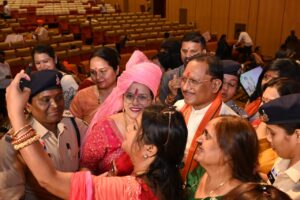 рдХрд╛рд░реНрдпрдХреНрд░рдо рдХреЗ рджреМрд░рд╛рди рдореБрдЦреНрдпрдордВрддреНрд░реА рд╢реНрд░реА рд╕рд╛рдп рдиреЗ рдЙрдкрд╕реНрдерд┐рдд рдорд╛рддреГрд╢рдХреНрддрд┐ рдХрд╛ рдкреБрд╖реНрдкрд╡рд░реНрд╖рд╛ рдХрд░ рднрд╡реНрдп рд╕реНрд╡рд╛рдЧрдд рдХрд┐рдпрд╛ред рдорд╣рд┐рд▓рд╛рдУрдВ рдореЗрдВ рдореБрдЦреНрдпрдордВрддреНрд░реА рдХреЗ рд╕рд╛рде рд╕реЗрд▓реНрдлреА рд▓реЗрдиреЗ рдХрд╛ рдЬрдмрд░рджрд╕реНрдд рдЙрддреНрд╕рд╛рд╣ рджреЗрдЦрдиреЗ рдХреЛ рдорд┐рд▓рд╛ред рдореБрдЦреНрдпрдордВрддреНрд░реА рдиреЗ рднреА рдЕрддреНрдпрдВрдд рд╕рд╣рдЬ рдФрд░ рдЖрддреНрдореАрдп рднрд╛рд╡ рд╕реЗ рд╕реНрд╡рдпрдВ рдорд╣рд┐рд▓рд╛рдУрдВ рдХреЗ рдореЛрдмрд╛рдЗрд▓ рд▓реЗрдХрд░ рдЙрдирдХреЗ рд╕рд╛рде рд╕реЗрд▓реНрдлреА рд▓реА, рдЬреЛ рдЙрдирдХреЗ рд╕рд░рд▓, рд╕рд╣рдЬ рдФрд░ рдЬрдирдкреНрд░рд┐рдп рд╡реНрдпрдХреНрддрд┐рддреНрд╡ рдХрд╛ рдкрд░рд┐рдЪрд╛рдпрдХ рдмрдирд╛ред рдпрд╣ рджреГрд╢реНрдп рдкреВрд░реЗ рдЖрдпреЛрдЬрди рдХрд╛ рдЖрдХрд░реНрд╖рдг рдмрди рдЧрдпрд╛ рдФрд░ рд▓рдВрдмреЗ рд╕рдордп рддрдХ рдЪрд░реНрдЪрд╛ рдХрд╛ рд╡рд┐рд╖рдп рд░рд╣рд╛ред
