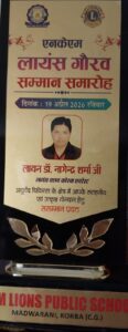 рд╢рд╣рд░ рдХреЗ рдорд╛рдБ рдордбрд╝рд╡рд╛рд░рд╛рдиреА рдкрд░рд┐рд╕рд░ рдореЗрдВ рд╕рдВрдЪрд╛рд▓рд┐рдд рдПрдирдХреЗрдПрдо рд▓рд╛рдпрдВрд╕ рдкрдмреНрд▓рд┐рдХ рд╕реНрдХреВрд▓ рдордбрд╝рд╡рд╛рд░рд╛рдиреА рдХреЗ 10рд╡реЗрдВ рд╕реНрдерд╛рдкрдирд╛ рджрд┐рд╡рд╕ рдХреЗ рдЕрд╡рд╕рд░ рдкрд░ рдЖрдпреЛрдЬрд┐рдд рднрд╡реНрдп рд╕рдорд╛рд░реЛрд╣ рдореЗрдВ рдЖрдпреБрд░реНрд╡реЗрдж рдЪрд┐рдХрд┐рддреНрд╕рд╛ рдХреЗ рдХреНрд╖реЗрддреНрд░ рдореЗрдВ рдЙрд▓реНрд▓реЗрдЦрдиреАрдп рдпреЛрдЧрджрд╛рди рджреЗрдиреЗ рд╡рд╛рд▓реЗ рд▓рд╛рдпрди рдбреЙ. рдирд╛рдЧреЗрдВрджреНрд░ рдирд╛рд░рд╛рдпрдг рд╢рд░реНрдорд╛ рдХреЛ тАЬрд▓рд╛рдпрдВрд╕ рдЧреМрд░рд╡ рд╕рдореНрдорд╛рдитАЭ рд╕реЗ рд╕рдореНрдорд╛рдирд┐рдд рдХрд┐рдпрд╛ рдЧрдпрд╛ред рдпрд╣ рд╕рдореНрдорд╛рди рдЙрдиреНрд╣реЗрдВ рдЙрдирдХреЗ рджреАрд░реНрдШрдХрд╛рд▓реАрди рд╕реЗрд╡рд╛ рдХрд╛рд░реНрдпреЛрдВ рдФрд░ рд╕рдорд╛рдЬ рдХреЗ рдкреНрд░рддрд┐ рд╕рдорд░реНрдкрдг рдХреЗ рд▓рд┐рдП рдкреНрд░рджрд╛рди рдХрд┐рдпрд╛ рдЧрдпрд╛ред