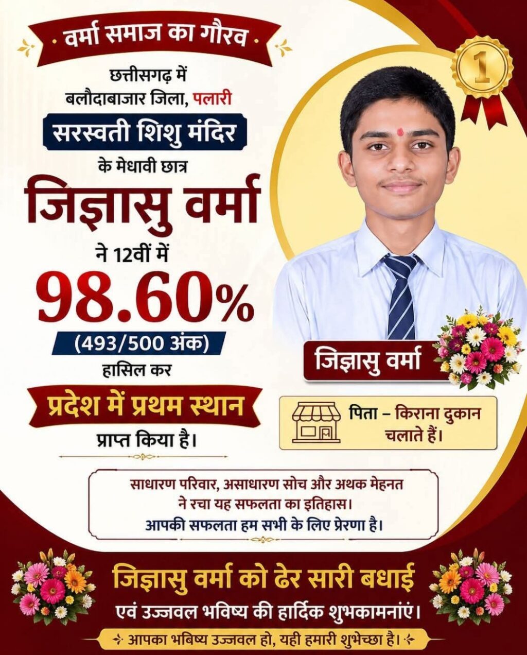 त्रिनेत्र टाइम्स कोरबा ****//**// कोरबा छत्तीसगढ़ के बलौदाबाजार जिले के पलारी क्षेत्र स्थित सरस्वती शिशु मंदिर के मेधावी छात्र जिज्ञासु वर्मा ने अपनी कड़ी मेहनत, लगन और दृढ़ संकल्प के दम पर 12वीं बोर्ड परीक्षा में शानदार सफलता हासिल करते हुए 98.60% (493/500 अंक) प्राप्त कर पूरे प्रदेश में प्रथम स्थान अर्जित किया है।