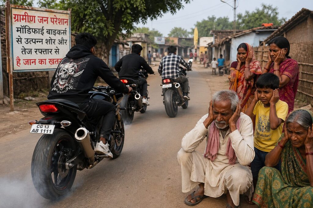 दिन-रात सड़कों पर तेज रफ्तार और कान फाड़ देने वाली आवाज़ के साथ दौड़ती बाइकों ने गांवों की शांति छीन ली है। रात के सन्नाटे में जब अचानक कर्कश आवाज गूंजती है, तो छोटे बच्चों से लेकर बुजुर्गों तक की नींद उड़ जाती है।