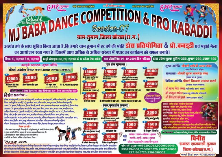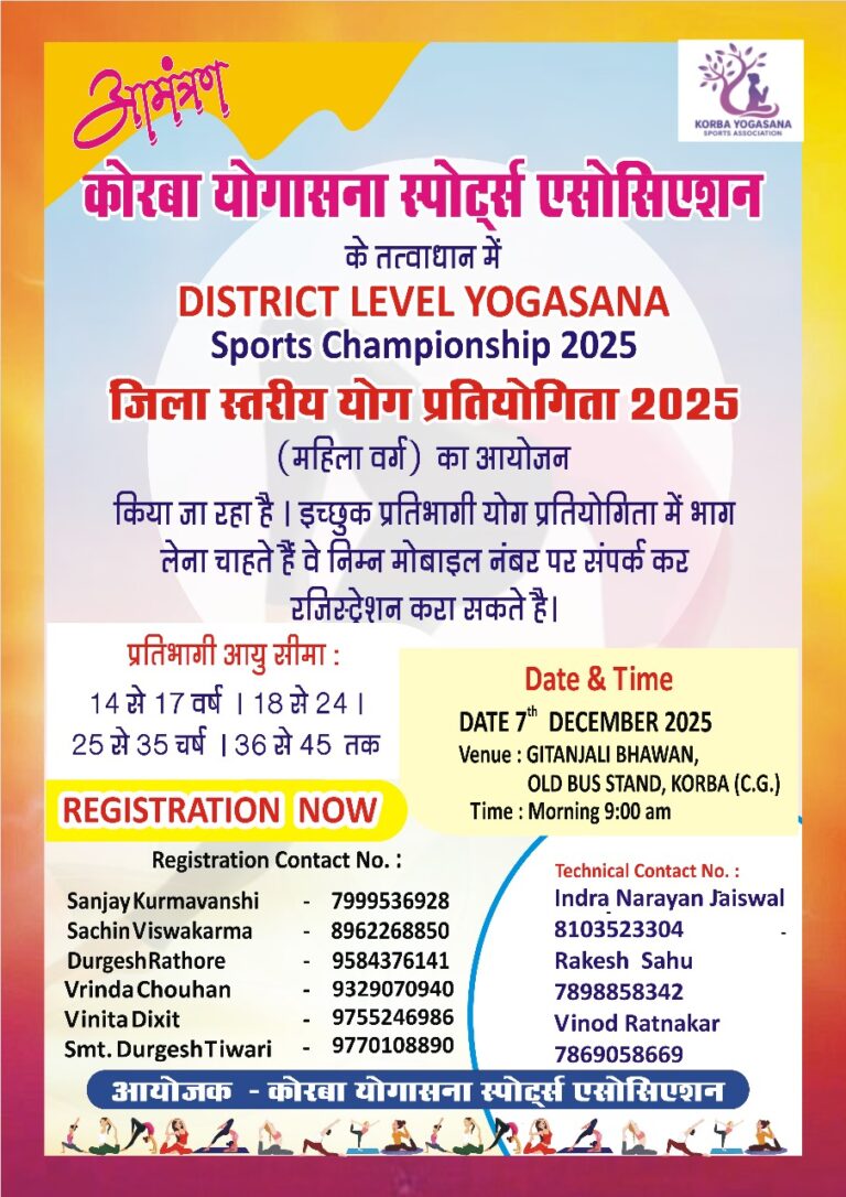 त्रिनेत्र टाइम्स कोरबा ****/ कोरबा योगासना स्पोर्ट्स एसोसिएशन जिला कोरबा द्वारा 7 दिसंबर 2025, रविवार को आयोजित होने वाली...