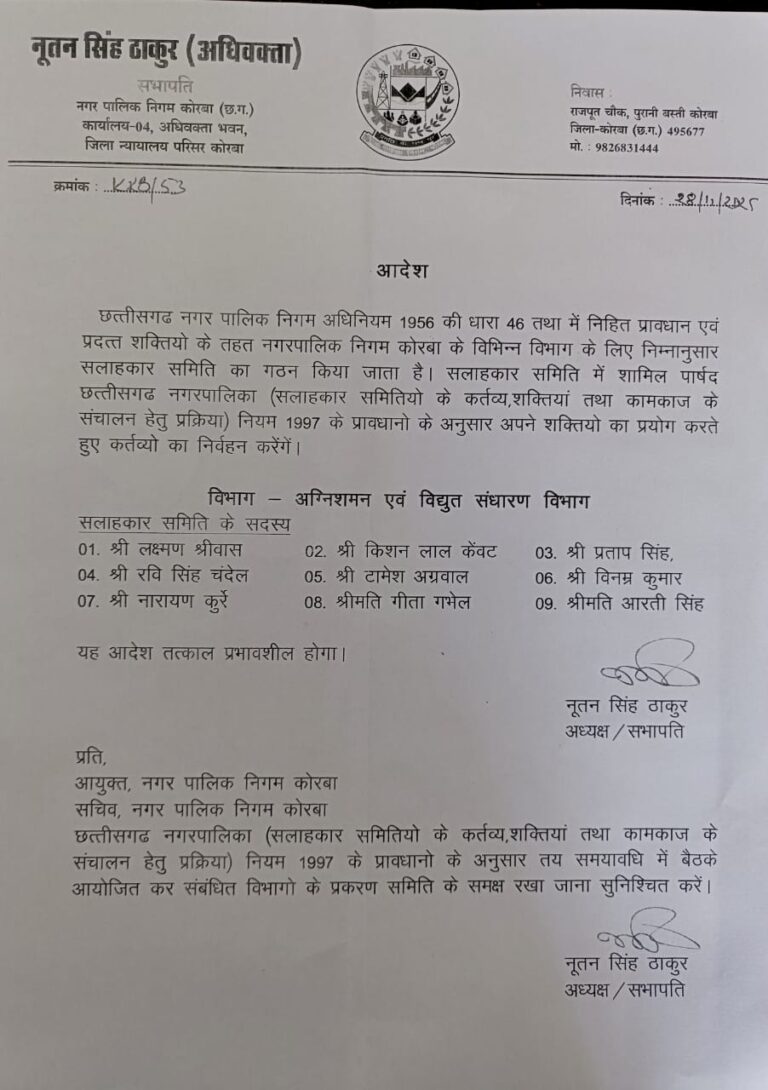 **कोरबा नगर निगम में नागरिक सुविधाओं और योजनाओं की निगरानी अब होगी और मजबूत— सभापति द्वारा सलाहकार समितियों का...