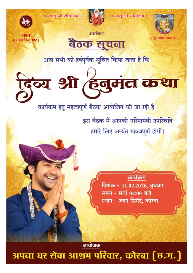 त्रिनेत्र टाइम्स कोरबा ****//** कोरबा परम पूज्य धीरेंद्र शास्त्री जी (बागेश्वर धाम) के कोरबा में प्रस्तावित कार्यक्रम को सफल...